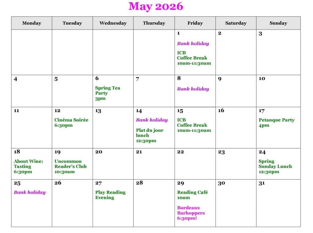 Meet us every 1st and 3rd Friday of the month throughout the year at the Café Français on the Place Pey Berland in central Bordeaux from 10am to 11:30am for coffee and a chat in English.